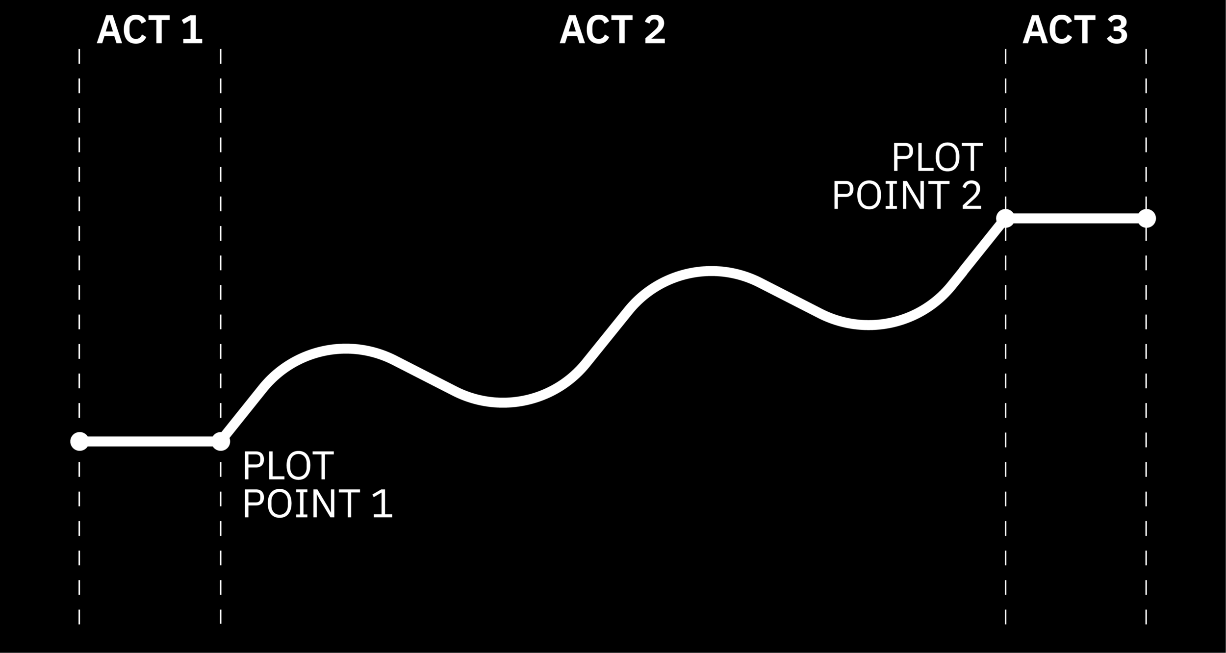 I know you’re probably thinking that this is getting long and is a lot for just a website, but this isn’t just a website, it’s a world, so stick with me a bit longer and you won’t be disappointed. Story is possibly the most foundational lens and definition necessary for ensuring your effective, immersive, and inquisitive experience with this world. I look at story through the lens of the story model, invented by Aristotle. Again, this is foundational to your understanding, and shows up in more and less obvious ways throughout this world. The Story model in its simplest form is composed of three acts (beginning, middle, and end), with two plot points connecting the acts (what some call the hook and climax).